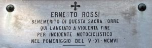 Una lapide collocata all’esterno della chiesa di Santa Croce a Padova ricorda una tragedia del 1906: lo schianto del giovane pilota Ernesto Rossi a bordo di una moto Peugeot 6 HP.