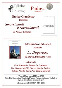 14 – XI – 2025 – “Smarrimenti e rinvenimenti” di Nicola Cetrano e “La Dogaressa” di Maria Antonietta Viero + Aggiungi a Google Calendar + iCal / Outlook export Data Ven 14 Nov 2025 Expired! Ora 17:00 Luogo Padova - Casa della Rampa