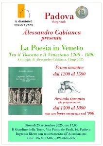 25 settembre 2025 – La poesia in Veneto tra il Toscano e il Veneziano 1200 – 1800 () + Aggiungi a Google Calendar + iCal / Outlook export Data Gio 25 Set 2025 Expired! Ora 17:00 Luogo Giardino della Torre, Via Pasquale Paoli, 16 - Padova Organizzatore Il Giardino della Torre