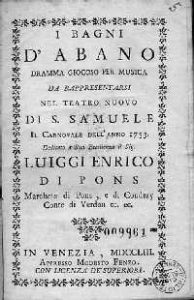 È questo il periodo in cui una serie di studi riporta in auge le pratiche terapeutiche legate al termalismo euganeo. Ed è questo il periodo in cui Carlo Goldoni, forse influenzato dall’atmosfera delle nuove scoperte e delle nuove mode, concepirà il libretto d’opera “I bagni d’Abano”. Nella sua ampia e diversificata produzione teatrale, scritta spesso in dialetto veneziano, ma talora anche in francese e in italiano, questo dramma giocoso, poi musicato da Baldassare Galuppi e da Ferdinando Bertoni, è povera cosa, come trovata e come fattura, in confronto alle sue commedie.