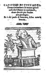 Uno degli esempi più significativi del repertorio dei trovatori cinquecenteschi è senza dubbio la storia del Paese di Cuccagna, che non è però un’invenzione del Rinascimento, atteso che sono molti i testi della letteratura anche antichissima, che trattano (o accennano) del Paese di Cuccagna o di simili luoghi immaginari.