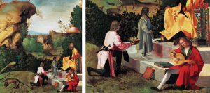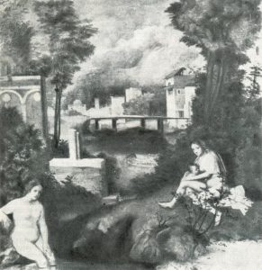 Giorgione, oltre alle sue frequentazioni nobiliari veneziane (i Vendramin, i Contarini, i Michiel, i Marcello…), fra il 1493 e il 1506 frequentava anche Padova, perché era un importante centro culturale e artistico, caratterizzato dalla presenza di una delle Università più antiche d’Europa, e di artisti interessati alla rappresentazione dell’uomo integrato nella natura. Questa caratteristica distingue i pittori veneti rinascimentali da quelli del centro Italia, che nelle loro opere collocano l’uomo in primo piano e la natura sullo sfondo, cioè l’uomo che domina la natura, come la Gioconda di Leonardo.